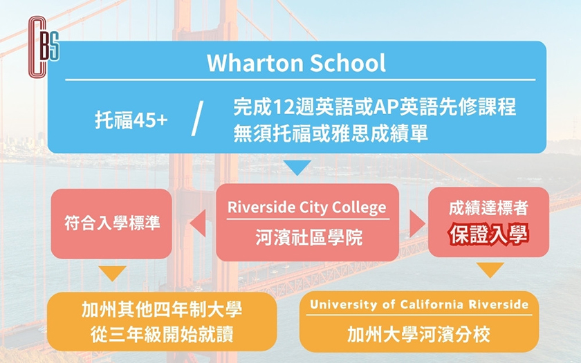 城市生活報 | 編輯部 台北編輯報導 | 2024.06.26 | CBS洋學願遊留學諮詢公司是一家有20年經驗在業界口碑受到一致推崇,非常重視學生獨特性及未來發展性的專業留學代辦公司,更是幫學生實現夢想的實踐者。致力於打造一個有溫度的留遊學資訊平台,讓每位夢想出國遊學、留學的學子們,能得到優質專業的個人化的服務。 圖文: CBS有一項特別的專案,應屆高中畢業生可以選擇2+2申請進入加州城市河濱學院), 在學成績GPA達到2.8以上保證進入UC-Riverside三年級 CBS有一項特別的專案,應屆高中畢業生可以選擇2+2申請進入加州城市河濱學院), (A)在學成績GPA達到2.8以上保證進入UC-Riverside三年級 (B)在學成績GPA 達到3.0以上,也可以協助申請其它四年制大學三年級。 完成學士學位。 Riverside City College加州城市河濱學院申請要求: 1. 年滿18歳 2. 持有高級中等學校文憑或同等學歷 3. 高中英文成績單 4. 托福成績 對於來不及準備託福考試,或託福成績不理想的學生,注冊Wharton 高中的在綫爲期12周的12年級高中英文課,或AP英語課,達到及格標準,由Wharton學校來辦理直升Riverside City College(RCC)無需再提交託福及雅思成績單,由RCC寄出入學通知以及I-20表。 關於 Riverside City College Riverside City College 具有100 多年的歷史 (學校官網:https://www.rcc.edu/)。 Riverside City College 是一所在加州的二年制公立的社區大學,學生在該社區 大學畢業後可直接轉到加州州立大學、若成績好的話, 可以轉入加州大學完成學士學位。 方案核心亮點 1. 前兩年節省學費(社區大學學費低),體現高學費性價比 2. 在學成績GPA達到2.8以上保證進入UC-Riverside三年級 3. 在學成績GPA 達到3.0以上,也可以協助申請其它四年制大學三年級。 圖文: 託福成績不理想的學生,注冊Wharton學校的在綫爲期12周的12年級高中英文課,或AP英語課,達到及格標準,由Wharton學校來辦理直升Riverside City College(RCC)無需再提交託福及雅思成績單,由RCC寄出入學通知以及I-20表。 關於Wharton School Wharton School(學校官網:https://wharton.education/) 由美國Cognia 認證, 並獲得美國內華達州教育委員會的許可,開設內華達州 教育部批准的線上高中及初中課程。學校的AP 課程(高 級預科)由美國大學董事會審核和批准。 台灣總部 CBS洋學願遊留學諮詢有限公司 地址:臺北市松山區復興北路57號3樓之5 電話:02-2740-1010 官網:https://www.cbs-edu.com/ FB:https://rink.cc/dcf3v 上海據點 : 200030上海市徐汇区东安路562号 绿地中心2期 8楼 8022室 上海越生春汇教育科技有限公司 TEL:86-21-3432-1470 FAX:86-21-3432-0473 |