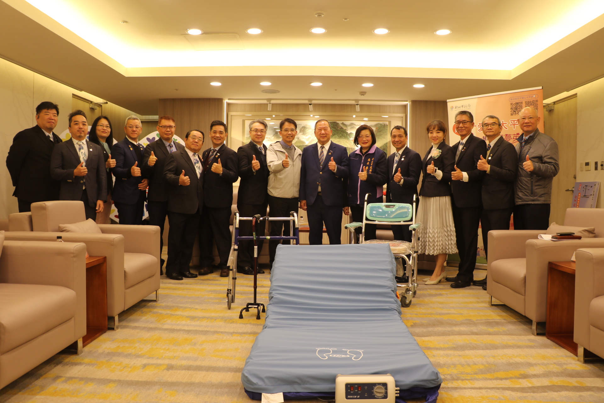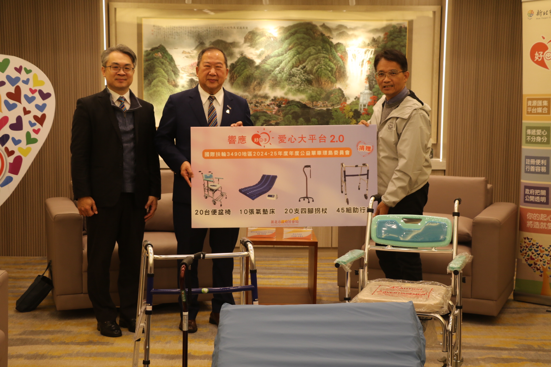 城市生活報|採訪編輯中心 編輯報導 |2025.02.24 | 國際扶輪3490地區2024-25年度公益單車環島委員會,於去年11月騎單車環島,沿途兼做公益,又響應新北市好日子愛心大平台,於24日捐贈10床氣墊床、20支拐杖、20台便盆椅及45台助行器,代表受贈的新北市政府秘書長邱敬斌表示,扶輪社一步一腳印、一騎車一公益,市府會將這些輔具評估媒合送到每一個有需求者的身上。 國際扶輪3490地區年度總監陳建勳表示,扶輪公益單車環島已進行11年,不僅透過騎單車環島愛台灣,並深入各地偏鄉,協助當地弱勢家庭,幫助完成夢想。由於社友熱情響應與環島勇士慷慨解囊,結餘60萬元除購買輔具,捐給新北市輔具資源中心外,並捐贈給桃園市私立脊髓損傷潛能發展中心、新生活社會福利發展促進會與亮翊洗衣庇護工場等社福團體,以造福更多的人群。 國際扶輪3490地區年度公益單車環島委員會主委鄭凱鴻表示,去年扶輪社友200多人響應公益單車環島,在10月26日至11月3日完成東西南北4個極地燈塔,途中雖經一個小颱風考驗,但社友仍克服完成,並安排4個偏鄉在地社區服務,包含恆春民謠促進會、屏東牡丹國小足球隊圓夢、台灣兒童發展早期療育協會和新生活社會福利發展促進會等,結餘的經費也全部捐作公益。 邱敬斌表示,新北市截至114年1月止,身障者人口有18萬3,129人,老年人口有77萬2,005人,輔具需求量非常高,新北市輔具資源中心係全國唯一公辦公營的輔具中心,服務績效全國第一,每年申請輔具補助達4萬人,同時每年媒合一萬多件的二手輔具,免費提供給有需要的民眾,讓資源循環再利用。 新北市社會局長李美珍說,家有失能者或身心障礙者,家中照顧者也會感到壓力,有了輔具的協助,將會提高生活的便利,改善生活品質。 |