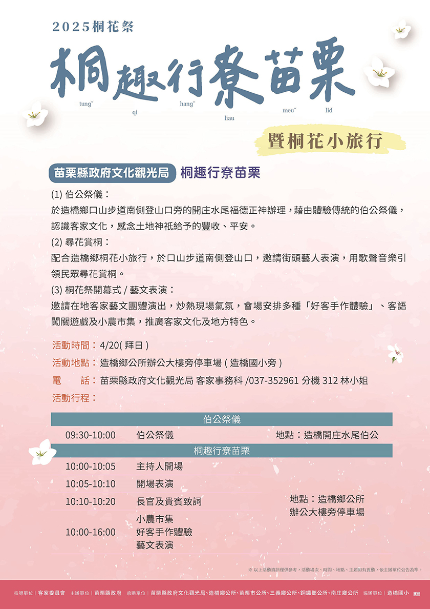 城市生活報 | 苗栗編輯中心 採訪報導 | 2025.04.18 | 隨著四月「五月雪」的浪漫季節來臨,苗栗縣年度春季盛事「2025桐花祭-桐趣行尞苗栗」將於4月20日上午在造橋鄉登場,活動地點位於鄉公所辦公大樓旁停車場及口山步道,邀請全國旅客一同走進山林,賞花趣遊。 活動當天上午在口山步道南側登山口旁舉行傳統伯公祭儀,依古禮進行「三獻禮」祈福儀式,揭開活動序幕。緊接著於造橋鄉公所辦公大樓旁舉辦開幕儀式,地方政府感謝中央單位的推動支持,使桐花祭成為年度觀光亮點。 本屆桐花祭融合山林生態、在地文化與農產特色,規劃豐富多元的活動內容,包括在地客家藝文表演、手作體驗、客語互動闖關、街頭藝人演出與小農市集,提供遊客賞花、聽樂、購物一站式體驗。 活動現場亦邀請造橋鄉多個社區共同參與,安排有廣場舞、民族管弦樂團表演等節目,讓民眾在桐花樹下聆聽悠揚音樂,享受自然與文化交織的愜意氛圍。賞花步道上也安排了生態導覽、無插電音樂演出,讓民眾在山林間悠然漫步,細細品味在地風情。 小農市集結合農產與文創商品展售,展示苗栗在地好物與青年創意成果。整體活動不僅讓遊客欣賞到雪白桐花的自然美景,也更深入認識地方產業與文化底蘊,感受山城獨有的魅力。 |