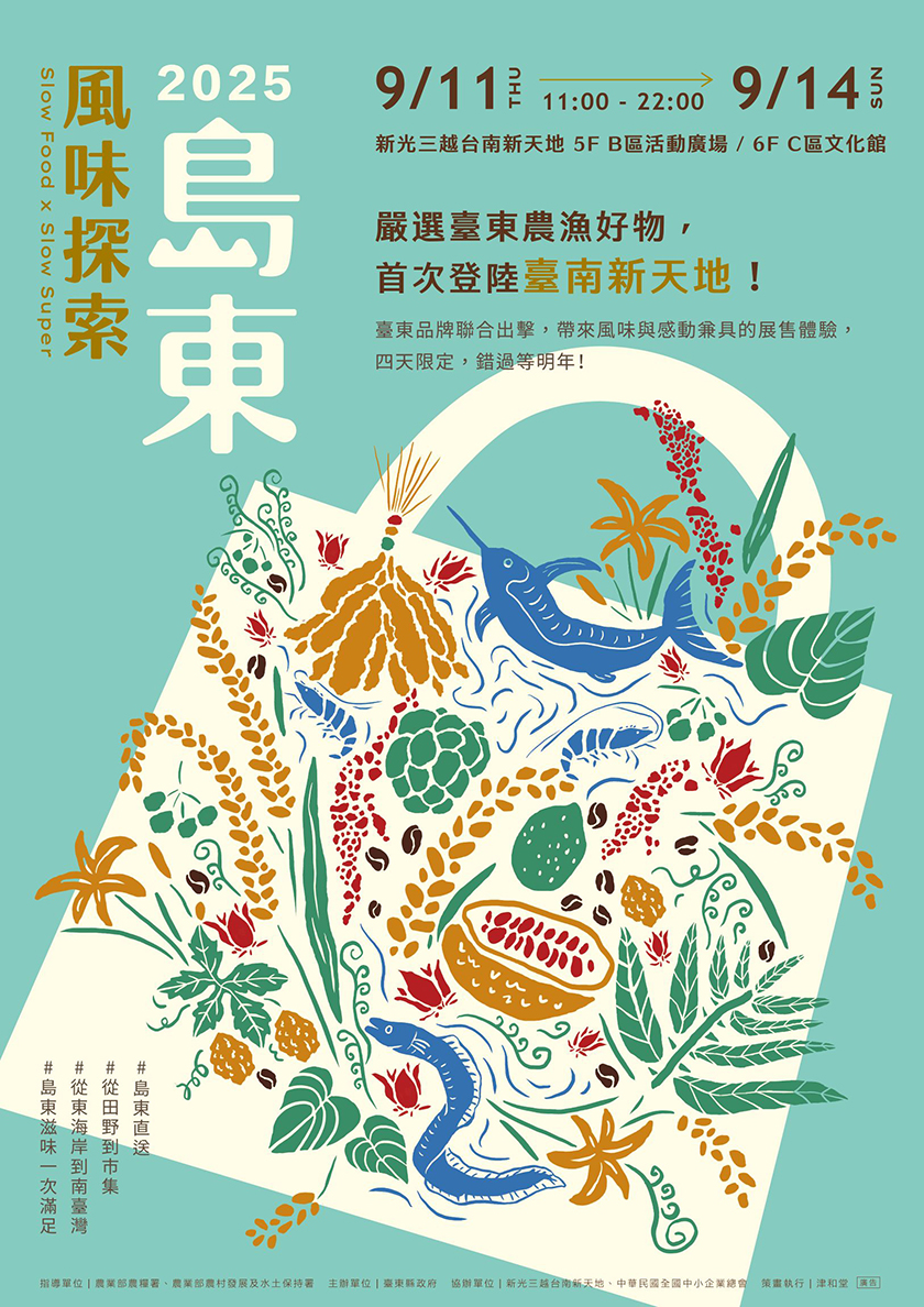 城市生活報 | 臺東採訪中心 編輯報導 | 2025.09.03 | 為推廣臺東永續農業與特色農食,臺東縣政府自9月11日起一連四天於新光三越臺南新天地舉辦《島東風味探索》農食展銷活動。活動結合 SLOW SUPER 慢農、SLOW FOOD 慢食及全臺精選品牌,將東部山海物產與在地文化帶入南臺灣美食核心區,邀請民眾品味一場獨特的風土饗宴。 展銷內容規劃八大主題,包括慢食、慢農、島西好朋友、臺灣鹽選隊、主廚餐桌、五感工作坊、快閃店以及足部健康驛站,現場除展示農產與飲食文化,也安排阿美族古法釀酒、布農族月桃編織、魚丸製作等手作體驗,並將長濱足療服務帶進百貨,營造從味覺到身心的療癒氛圍。 活動更邀請南臺灣知名主廚現場料理展演,以東海岸海鮮與山林食材,結合精湛廚藝,呈現跨越山海的創新料理。 主辦單位表示,去年度活動曾創下單日百萬元業績,廣受消費者青睞。今年再次進軍臺南,攜手全臺特色品牌,包括草本飲品、果乾、精釀酒、手工奶油、特色鹽品及多元農產禮盒,提供民眾中秋佳節一站式選購,展現臺東與臺灣各地的豐饒風土與無限創意。 |