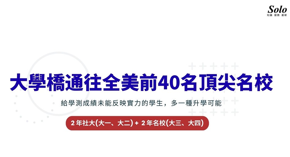 大學橋通往全美前40名頂尖名校 給學測成績未能反映實力的學生,多一種升學可能 2年社大(大一、大二)+2年名校(大三、大四) 大學橋(University Bndge)是一種從美...