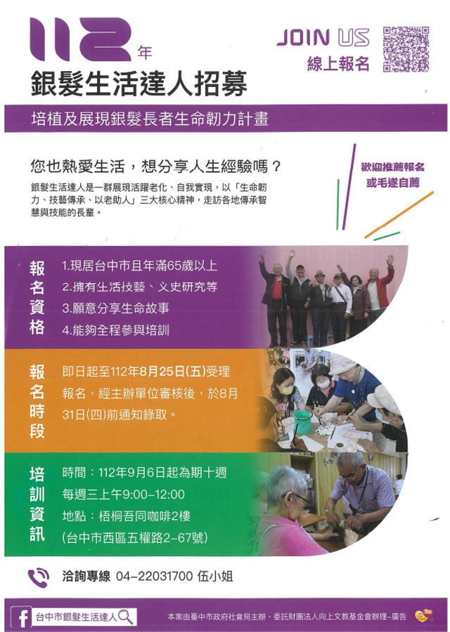 CLN城市生活報 | 本報編輯部 台中編輯報導 | 2023.08.15 | 每位長輩都是社會的寶!台中市政府社會局表示,長輩是台中市的活資產,值得將豐富的人生經歷及才藝,分享給各年齡層的民眾;台中市現正招募新進銀髮生活達人,即日起至8月25日開放報名,歡迎65歲以上設籍台中市,熱愛生活、喜愛分享的長輩一同「銀」向未來。 社會局委託向上文教基金會,自104年至今培訓76位銀髮生活達人,在社區舉辦近400場巡演,服務超過1萬7,000人次,以生命韌力、技藝傳承、以老助人三大精神投入社區服務,傳遞高齡正向價值;達人平均年齡74歲,最高齡92歲的江阿本爺爺,擁有近80年的竹編經驗,在社區仍相當活躍。 「原來工作中的點滴,都是支持生命的力量。」70歲的陳秀玉女士表示,15年前因為丈夫罹患罕見疾病,當月嫂一肩扛起家計。過去她一直認為自己沒有才能,直到2年前自薦參加銀髮生活達人培訓,回顧生命經驗,學習表達技巧,更了解自己的價值,加入達人行列到社區分享溫暖。 另外一位丟丟銅仔沙包童玩達人、75歲的程蘭鈺女士,有感於3C時代記憶中的古早童玩逐漸消失,參加達人培訓後,滿懷熱情地研發各種造型沙包,帶大人小孩體驗趣味多元的沙包玩法,展現技藝,永續傳承。 社會局說明,銀髮生活達人培訓課程,自9月6日起每週三上午9時至12時,連續10週,歡迎各領域舉薦長輩或自我推薦,精彩自己的第三人生。相關資訊可查詢社會局官網(https://www.society.taichung.gov.tw/2414025/post)或洽招募專線04-22031700 伍小姐。 |