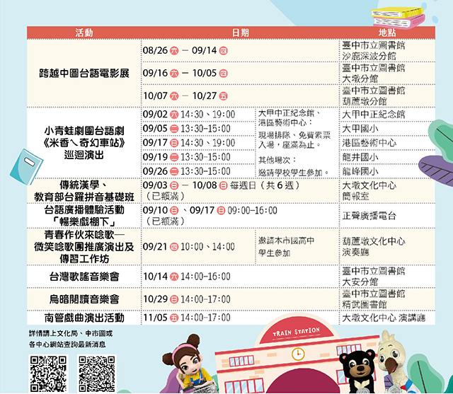 CLN城市生活報 | 本報編輯部 台中編輯報導 | 2023.08.29 | 說學逗唱樣樣來,學台語可以輕鬆又有趣!台中市政府文化局「傳文化,說母語」系列活動自8月起開跑,串連市立圖書館及各文化中心推出超過150場次的台語傳習活動,包括台語說演故事、廣播體驗、電影賞析、台語音樂會、兒童劇巡演、唸歌傳習工作坊、傳統漢學台語和歌仔戲研習等,歡迎市民一同走進台語的世界,感受語言文化的豐富魅力。 文化局長陳佳君表示,母語不只是日常生活中溝通的語言,更藉由文學、音樂、戲劇和電影等多元藝術形式,讓文化代代傳承;「傳文化,說母語」系列活動由文化部指導,自8月中旬開始,中市圖各館舉辦100場故事說演活動,帶領讀者和親子共同體驗台語的親切感;並舉辦台語廣播體驗,邀請專業講師帶領學員進行表演訓練、熟悉廣播器材,最後一起演出台語廣播劇,留下有趣的回憶。 文化局說明,「跨越中圖台語電影展」8月26日起已接連在沙鹿深波分館、大墩分館及葫蘆墩分館展出,放映跨越台灣不同年代的台語電影,映後賞析講座也將邀請作家蘇致亨、台中市影視發展基金會執行長林盈志和導演洪馬克等,與觀眾一起探究台語電影的迷人世界;大安分館10月14日將邀請大甲愛樂室內樂團演出台語音樂會,讓民眾透過五感體驗台語的魅力;精武圖書館將於10月29日舉辦「烏暗閱讀音樂會」,讓觀眾體驗在全黑空間中聆聽音樂的感受。 文化局指出,除了日常生活的口說台語,透過傳統漢學更能體驗台語的語文趣味和音韻之美。9月起將在大墩文化中心舉辦「傳統漢學(台語)、教育部台羅拼音初階班」,邀請台中市海洋台語文研究學會,帶領民眾透過描寫台中的古詩雜詠,感受台語詩文中的台中在地風土之美;深受親子歡迎的小青蛙劇團,特別與金牌製作人林垂立合作製作台語兒童劇《米香ㄟ奇幻車站》,以多首耳熟能詳的台語歌曲,串起感人、有趣的人生故事,9月2日起於大甲中正紀念館、9月17日於港區藝術中心及校園巡迴演出5場。 此外,葫蘆墩文化中心9月21日舉辦「青春作伙來唸歌-微笑唸歌團工作坊」,以輕鬆活潑的方式帶領國中、高中學子進入台語唸歌的世界;大墩文化中心則於11月份邀請「重要傳統藝術南管戲曲保存者」林吳素霞女士及台語戲曲重要演藝團隊-合和藝苑,演出四空管四字環曲目,帶領民眾認識泉腔及南管戲曲的傳統藝術。更多活動資訊及報名方式請上文化局官網( https://www.culture.taichung.gov.tw/2407659/post )、中市圖官網( https://reurl.cc/VLkZmA )及各中心網站查詢。(8/28*6)*文化局 |