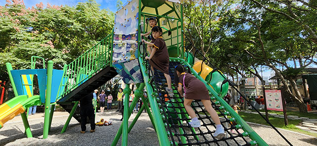 CLN城市生活報 | 本報編輯部 新北編輯報導 | 2023.10.23 | 土城永豐社區公園首次全面翻修,提升公園設施優化使用空間,今(23)日土城區長周晉平、永豐里長黃榮沐及里民們共同為公園翻修後啟用慶祝,本次改善工程取地方永(有)豐(鳳)里(梨)諧音,將特色遊具設計為「鳳梨造型攀爬溜滑梯」,並新設性別友善及無障礙公共廁所,提升使用公園的民眾便利性。未來區公所預計再推動3處公園廣場休憩環境改善升級,提供市民更優質的健康生活環境! 土城區長周晉平表示,永豐社區公園於民國94年啟用,區公所為讓周邊里民休閒運動空間更加舒適多元,將兒童遊戲場主題以奇想諧音「永豐里.有鳳梨」打造「鳳梨造型攀爬溜滑梯」!除了將代表性的意象作為設計重點,強化地方特色外,攀爬式網架也改變單調罐頭遊具的制式玩法,提升公園遊戲的冒險性及挑戰性。鳳梨造型遊具搭配高透水性、自然環保的礫石鋪面,自然新穎的特色公園也讓人眼睛一亮! 本次改善工程設計階段除了蒐集地方意見,也邀請特公盟參與規劃,除了將公園遊具種類有別於鄰近兒童遊戲場,讓遊戲性更多元,遊戲場鋪面也選用天然的礫石材質,改善地坪濕滑問題,同時也具備環保及提升排水功能,更友善孩童身體健康,兒童遊戲設施變得有趣又好玩。考量永豐公園及鄰近的百喬廣場相當多運動健走的市民,目前公園無設置廁所,相當不便,因此也採納永豐里長黃榮沐建議,於公園內設置性別友善及無障礙公共廁所。另外,體健區設施空間改善也讓公園煥然一新,里民們都相當稱讚!本次啟用儀式中,也邀請到在地永豐廣場舞班及幼兒園小朋友為活動趣味開場,現場氣氛歡樂熱鬧。 永豐社區公園改善後,能提供市民更優質的健康生活環境。目前永寧廣場改善工程規劃辦理中,同時土城體育場假日藝術廣場及員和公園營造工程也將於近期動工,公所團隊將以客家特色主題進行景觀營造工程,提供市民多元的休憩環境,創造更多地方特色,歡迎市民朋友來土城的公園遊玩。 |