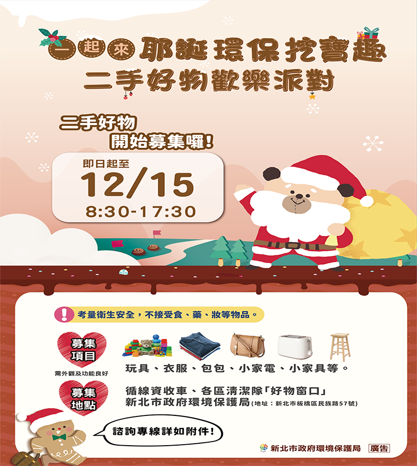 CLN城市生活報 | 本報編輯部 新北編輯報導 | 2023.11.06 | 新北歡樂耶誕城17日即將開城,環保局一年一度的「耶誕環保挖寶趣─二手好物歡樂派對」義賣活動將在12月23日於新北市民廣場舉辦,今(6)日發布二手好物召集令,自即日起至12月15日止,歡迎民眾將鮮少使用且功能完好的二手物品交給清潔隊循線收運資源回收車,或各區清潔隊的「好物窗口」,活動義賣善款將全數納入「新北市愛心大平臺」,不只能延長二手好物的生命週期做環保,更能做公益、讓愛循環。 環保局說明,為推廣資源循環再利用、愛物惜物的精神,環保局即日起至12月15日止透過清潔隊循線收運資源回收車及各區清潔隊「好物窗口」回收各式二手物資,民眾可藉機盤點家中只使用過幾次即發現不適合自己的產品、使用率低或衝動性消費的物品,包含外觀及功能良好的玩具、衣服(不含貼身衣物、外觀明顯受損衣物)、包包、書籍(不含報紙、期刊雜誌等有期限性之書刊)、小家電、小家具及腳踏車等,都可捐出義賣,讓二手好物在歡樂派對中遇見新主人、重獲新生。 環保局表示,新北市辦理歡樂耶誕城系列活動「耶誕環保挖寶趣」已邁入第9年,為全國最大的愛心跳蚤市場,去(111)年活動吸引了近3萬5千人熱情參與,盛況空前,而過去8年累積義賣金額約新臺幣608萬元,皆納入「新北市愛心大平臺」幫助需要的人。今年活動將於12月23日下午展開,以歡樂派對為主題,設置48個二手好物義賣攤位,歡迎民眾捐出各式鮮少使用且功能完好的物品,年底一起挖寶趣。活動詳情可至新北市政府環境保護局網站查詢(http://www.epd.ntpc.gov.tw/)。 |