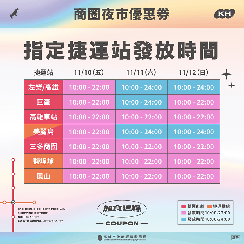 CLN城市生活報 | 本報編輯部 高雄編輯報導 | 2023.11.06 | 高雄演唱會經濟持續發威,今年高雄已舉辦近50場演唱會,吸引超過70萬人次,11月英國天團COLDPLAY接力獻唱,高雄市政府延續上半年「加食延暢」計畫,樂迷憑COLDPLAY 2023高雄演唱會門票,10-12日早上10時到晚上10時在7處高雄捷運站領取50元商圈夜市優惠券,其中部分臨近夜市、飯店區的站點也貼心延長發放時間至晚上12時。使用範圍不僅包含高雄20處商圈、24處夜市,更特別邀請超過50家的夜經濟特色店家,代表性的居酒屋、餐酒館、小吃火鍋等都能使用,許多業者也自主延長營業時間或推出限量優惠來迎接歌迷。 高雄市政府經發局長廖泰翔表示,今年高雄迎來演唱會熱潮,國內外天團與歌手相繼在高雄開唱,市府推出「商圈夜市優惠券」,於鄰近捷運站同步設攤發放,吸引數以萬計的歌迷湧入商圈、夜市消費,業績至少成長三成,在商圈夜市的店家與攤商紛紛敲碗的期待下,市府將於11月10日至12日三天在左營、巨蛋、高雄火車站、美麗島、三多、鹽埕埔和鳳山等7處捷運站,從上午10時到晚上10時設站服務發送,部分站點還配合散場及鄰近夜市服務到凌晨12時,歡迎持票樂迷把握三天機會前往就近站點領取,聽演唱會換優惠。 廖泰翔強調,為體貼歌迷保存門票紀念的需求,上半年憑票領取時採隱形墨水驗證,不在票券上造成任何可視記號,廣受歌迷好評,而這次為配合COLDPLAY推出的專屬紀念票卡,也特別進階服務,於捷運站兌換處透過掃描票卡上具唯一性的QR Code進行優惠券領取驗證,保持票卡完整性、不會留下記號,更不會影響入場,請樂迷放心,踴躍領取。市府除了提供舒適的消費體驗,更將完善硬體建設、行政協助、交通疏運接駁及環境清潔等面向,發展演唱會經濟,帶動高雄榮景。 參與這次合作店家的網美肉圓店「碧南庄」,特別為了本次COLDPLAY演唱會,延長營業時間,原來19:00打烊的帥老闆特別堅持陪伴所有COLDPLAY樂迷,加碼營業到24:00一起狂歡。老闆還特別加碼,COLDPLAY演唱會期間,持演唱會門票單筆消費滿300元就打九折,若再使用商圈夜市優惠券還再折抵50元,等於約打了7折相當划算。 六合夜市管委會主委莊其章表示,上半年演唱會,六合夜市攤攤業績爆棚,非常期待國際巨星的到來,以及市府的演唱會對接方案。為了因應COLDPLAY演唱會,攤商有了上次的經驗,更是磨刀霍霍,不僅備料比平常多3倍,還安排更多工作人手,捲起袖管來迎接這3天的爆炸人潮,也感謝市府經發局,一次又一次讓攤商荷包賺滿滿,更歡迎遠道而來的粉絲到夜市吃在地銅板美食,深度體驗高雄夜生活。 這次商圈夜市券除可在20處商圈、24處夜市的合作店家和攤商使用外,市府也廣邀高雄青年創業店家參與,共計有超過50家餐廳、居酒屋、宵夜及餐酒館加入本次獨立合作店家。這次的商圈夜市優惠券可以使用到明(113)年2月29日,歡迎各位樂迷,不要猶豫,把握機會領取,多多到高雄的商圈夜市及合作獨立店家「加食延暢」消費!有任何問題請洽客服專線(07-9722195)。 |