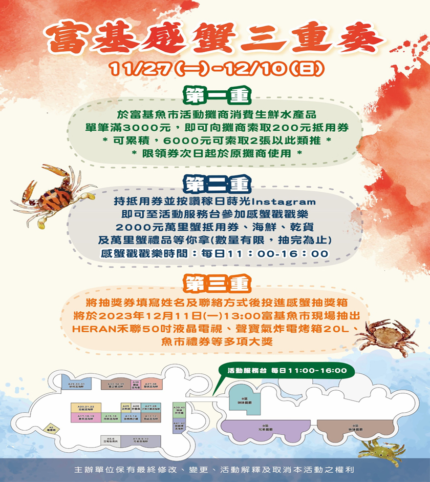 CLN城市生活報 | 本報編輯部 新北編輯報導 | 2023.11.27 | 目前萬里蟹盛產,新北石門的富基漁港除了供應現撈美味的海鮮,也是北海岸萬里蟹的知名產地,是各地民眾大啖海味的最佳選擇。「富基感蟹三重奏」活動將於11月27日開跑,來富基魚市消費滿額,不僅限量送消費抵用劵、現場參加「感蟹戳戳樂」,後續還有富基魚市禮劵、餐廳抵用券、家電等豐富大獎,最大獎有50吋電視,新北市漁業處邀請大家前來富基魚市品嚐當季鮮蟹及採買各式新鮮漁貨,限量超值好禮等您來拿! 富基魚市為歡慶萬里蟹季,11月27日至12月10日舉辦「富基感蟹三重奏」促銷活動,活動期間民眾前來富基魚市水攤單筆消費滿3,000元即可享有三重優惠—第一重可獲200元抵用劵一張,使用期限至113年2月29日;第二重憑抵用券現場可參加「感蟹戳戳樂」,有機會獲得萬里蟹券(價值2,000元)、海鮮、乾貨、萬里蟹帽、萬里蟹杯袋等魚市好禮(數量有限,抽完為止);第三重還可抽富基魚市禮劵、餐廳抵用券、家電等,最大獎是50吋電視,將於12月11日於魚市現場及新北漁樂快爆FB直播抽出。富基優惠獎不完,心動不如卡緊行動前往試試手氣! 富基漁港是臺灣極北漁港,港內魚市的墨西哥帽造型外觀,為北海岸增添奇趣浪漫的景觀,魚市內的水攤商家,不少都是家族從事捕蟹,擁有天時地利人和之勢,能收到當日捕獲到港規格佳且鮮活的第一手萬里蟹,讓富基漁港成為北海岸萬里蟹的重要產地。遊客來此除了可以購買到生鮮魚貨、品嚐海味美食,還能到港區的重機驛站及突堤碼頭欣賞美麗的夕照,甚至有機會可以觀察到捕蟹船的卸貨作業。現在正是萬里蟹最鮮美的時節,是許多饕客大啖海鮮的首選,到富基魚市採買新鮮萬里蟹,可馬上由兄弟海產、味味海鮮、姊妹餐廳、張專業生魚片等魚市餐廳提供代客料理,美味的螃蟹馬上趁鮮上桌! 新北市漁業處表示,富基魚市保障消費者權益,活海鮮價錢標示清楚透明,並設置公平秤讓民眾使用,確保斤兩確實,另魚市餐廳也裝設了透明的玻璃窗,讓廚師烹飪過程透明化,而魚市水攤今年10月甫經本市法制局消保官進行磅秤查驗全數合格。來富基魚市消費,不論買、吃都能安心,並提供臺灣pay多元支付服務,歡迎民眾來富基魚市品嚐美味鮮蟹、參加「富基感蟹三重奏」活動,並可順路漫遊富貴角燈塔、老梅綠石槽、金點草里驛棧、石門婚紗廣場及石門風箏公園等特色景點,欣賞北海岸的美好風光! 抽獎活動詳情請洽:富基魚市管理單位-生活家事業有限公司 (02)26381367 李小姐 臉書搜尋:富基漁港魚產品銷售中心、新北漁樂快爆 |
