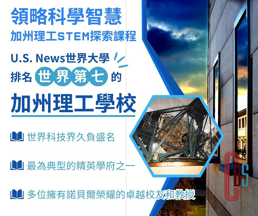 城市生活報 | 本報編輯部 台北編輯報導 | 2024.03.21 | 洋學願遊留學推出 2024暑期 加州理工"STEM與社會科學融合"探索課程適合9-18歲,對STEM感興趣,課程時間為7月和8月 2周。 圖文:2024暑期 加州理工"STEM與社會科學融合"探索課程 加州理工學院California Institute of Technology,簡稱為加州理工Caltech,創立於1891年,位於美國加利福尼亞州洛杉磯東北郊的帕薩迪納市,是世界著名私立研究型大學,是公認最為典型的精英學府之一。 加州理工在世界科技界久負盛名,其優勢學科包括基礎理科的物理學、化學、天文學和空間科學等。加州理工學院的規模不大,現有1204名研究生和977名本科生,約有300名教授以及超過600名研究學者。 截止2020年10月,加州理工學院的校友、教授及研究人員中,共有40位校友或教授獲得41次諾貝爾獎(包括其他研究人員總人數達76人)、4位獲得菲爾茲獎(數學界的諾貝爾 獎)、6位元獲得圖靈獎(電腦界的諾貝爾獎),70位校友獲得美國國家科學獎章或國家技術與創新獎章,112位教授獲選為美國國家學院院士。 圖文: 加州理工學院California Institute of Technology校園 另外,美國國家航空航天局NASA的噴氣推進實驗室JPL 也是由加州理工學院管理。2020-2021年度 ,加州理工學院位列U.S. News世界大學排名世界第七 。 CBS美劇《生活大爆炸》也把加州理工學院作為背景地 。 圖文: 加州理工學院California Institute of Technology校園 加州理工STEM與社會科學融合課程:充滿社會責任與挑戰的項目,加州理工帶給你無限發揮和緊張刺激的學習體驗 •專業能力提升 結業作品以團隊合作為基礎,培育未來工程師的領導力! •留學背景提升 加州理工官方顆課程結業證書,加州理工在再職教授出具學生個性化推薦信,具有極高含金量! •校友資源提升 不必出國,經過面試甄選,與一群來自五湖四海的精英同學們 雲”課堂相聚”教學相長,寓教於樂! •演講能力提升 全英文授課,與教授直接交流互動,鍛鍊英文溝通與演説能力! •領導力提升 結業作品以團隊合作為基礎,培育未來工程師的領導力! 加州理工官方顆課程結業證書,加州理工在再職教授出具學生個性化推薦信,具有極高含金量! 結業作品以團隊合作為基礎,培育未來工程師的領導力! 圖文: 加州理工學院California Institute of Technology校園美景 Caltech課程收穫: 本課程由加州理工在職教授研發,探討科技與社會的關係,教導學生運用科學的 方法研究社會上問題,運用設計思維解決社會問題,使用Python數據視覺化,搭配WIX建位網站,結合UI設計、 幻燈片演示及演講全方位展示學生對社會問題的研究及成果。課程由加州理工現任教授加持,教育導學生如何使用資料生動的描繪一個完整的故事,加深學生對數據科學的興趣。 課程完結,所有學生將獲得加州理工官方結業証書及教授推薦函! 2024 Caltech暑假課程開班計畫: Caltech課程包含 1.緊跟社會熱點問題,提出解決方案 2.運用設計思維解決問題 3.運用科學方法建立並驗證假設 4.建立專案研究的檔案記錄 5.大資料分析簡介 6.Python程式設計語言在科研方面的運用 7.數據視覺化 8.網站設立,UI設計 9.數學在科學研究及日常生活中的實際運用 招生對象: 1.學生年齡9-18歲,具備一定英語基礎 2.對STEM感興趣 3.學習態度認真,積極配合完成小組任務 開班情況: 1. 每班最低開班人數為12人 2. 師資配置:1位加州理工授權認證講師+1-2位助教 3. 課程費用:美金16000(實體課程) Caltech 課程時間為7月和8月 2周 CBS洋學願遊留學諮詢有限公司 地址:臺北市松山區復興北路57號3樓之5 電話:02-2740-1010 官網:https://rink.cc/fqjjt FB:https://rink.cc/dcf3v https://cbsedu.org/caltechstem/ 加州理工學院STEM探索課程 |