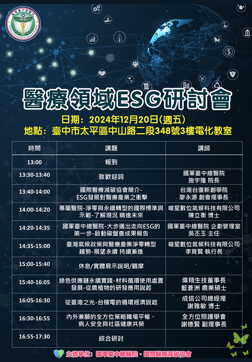 城市生活報 | 台中編輯中心 編輯報導 | 2024.12.17 | 國軍台中總醫院與國際醫療減碳協會將於12月20日(星期五)下午1:00,在台中市太平區中山路二段348號3樓舉辦一場關於醫療領域ESG研討會。此次研討會旨在探討醫療機構在實現淨零碳排放及永續轉型方面的國際標準與實踐策略。 研討會將邀請多位專家學者進行演講。陳立衡博士將分享有關淨零與永續轉型的國際標準,重點包括ISO 14064-1碳盤查標準及其在醫院的實踐策略、ISO 14067碳足跡標準、GRI準則的永續轉型與報告書制定,以及專屬醫院的評鑑標準。 此外,國軍台中總醫院的吳丕玉主任將介紹「大步邁出走向ESG的第一步」,並報告碳盤查/ISO 14064-1的成果。國際醫療減碳協會的淨零永續召集人李育賢將針對台灣氣候政策及醫療產業的淨零轉型趨勢進行深入分析,內容涵蓋國際與台灣政府的淨零政策、綠色醫療產業的趨勢與案例、綠色採購及供應鏈的淨零轉型概論,以及醫療院所數位科技應用於淨零轉型的實例。 此外,偉翔生技董事長藍蒼洲將主講「綠色供應鏈永續實踐」,探討材料循環使用及處置的發展,並從農植物的研發應用切入。謝雅敏博士則將以台積電的循環經濟為例,分享其在永續發展上的成功經驗。全方位照護學會的謝德賢副理事長也將提出「內外兼顧的全方位策略」,強調職場平權、病人安全與社區健康的共榮。 本次研討會誠摯邀請對醫療ESG議題感興趣的朋友參加,共同探討未來醫療產業的可持續發展之路。 |