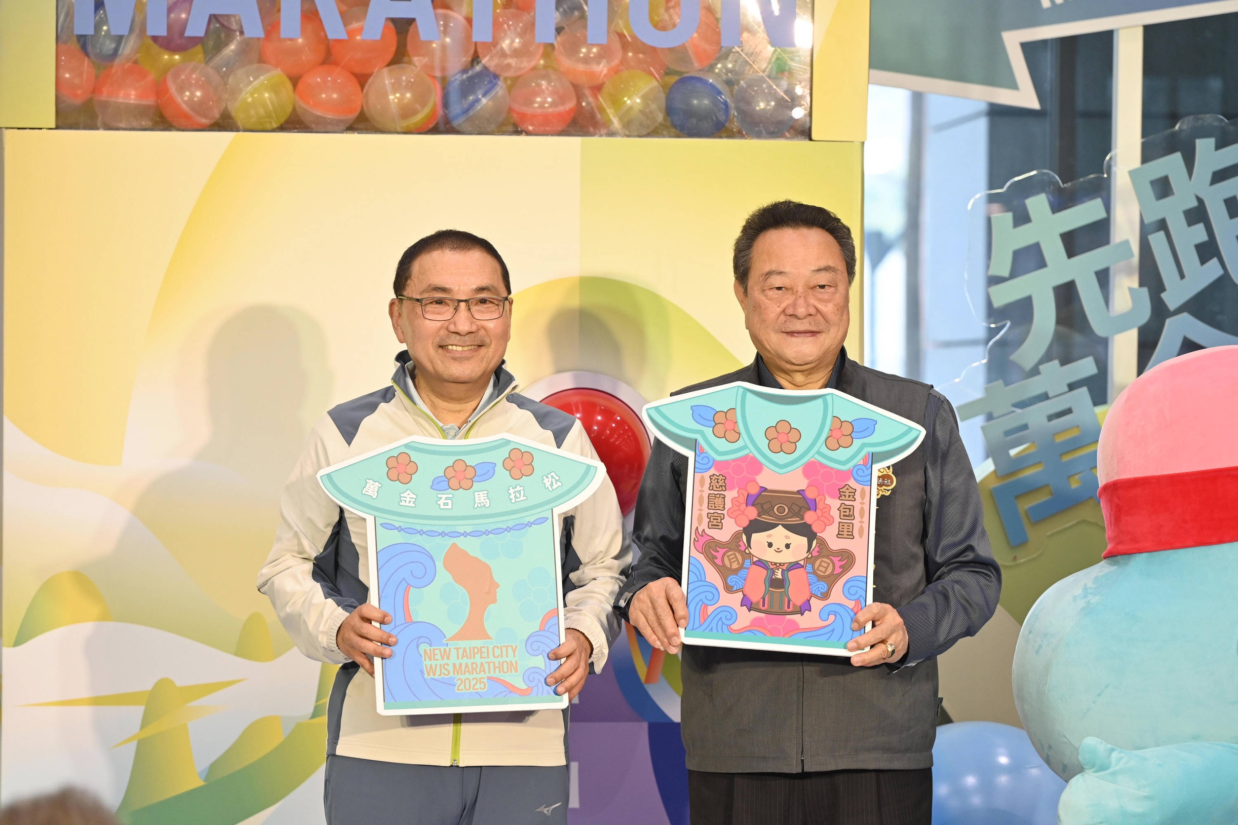 侯友宜表示,萬金石馬拉松邁入第23年,是全國第一個獲得金標籤認證的馬拉松賽事,每一年都推陳出新,不僅延續永續發展政策製作環保跑衣,今年更首度與金包里慈護宮推出聯名小物,祝福跑者們都能健康平安。此外,本次賽會串聯沿線190間友善商家,打造新北獨有的宗教文化觀光之旅。