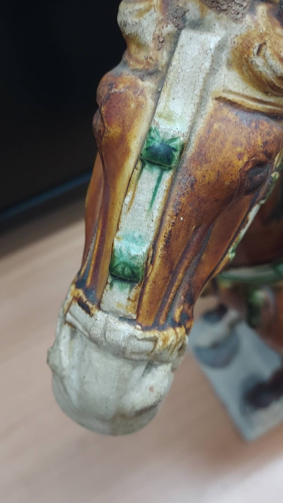 城市生活報 | 城市藝術線上 編輯報導 | 2025.03.23 | 唐三彩駿馬中最為特色的不外乎三花駿馬。 所謂三花馬是指馬鬃經精心修剪後形成三縷堞垛狀的鬃毛。用「三花」來裝飾馬,是唐代宮廷和貴族間流行的時尚。目前唐墓出土的馬俑有一花、二花和三花馬,三花不僅是裝飾,還是良馬的最高標誌。《唐六典》記載:「凡外牧進良馬,印以『三花』、『飛』、『風』之字,而為志焉。」唐太宗陵前的「昭陵六駿」,馬鬃都被修飾成三花的樣子。 唐代繪畫和雕塑中,三花馬也屢見不鮮。馬鬃剪花的習慣可能是受突厥的影響,突厥馬是唐朝馬的主要來源。突厥和唐王朝關係密切,他們通過貿易、進貢或饋贈等方式,把優良品種的馬連帶馬鬃剪花的習俗都傳入了唐朝。 這件唐三彩三花駿馬造型碩實健美,通體垂流著唐三彩綠黃白古樸的色彩,釉彩也因時間久遠而呈現七彩光,相當獨特驚豔。在高倍顯微底下,特殊重鉛彩料在時間溫釀所呈現的膚狀方形開片及隆起,相當標準及讚賞。整體無任缺陷及磕碰,完整度百分百,可見收藏家對這件唐三彩三花馬的極其愛護。 |