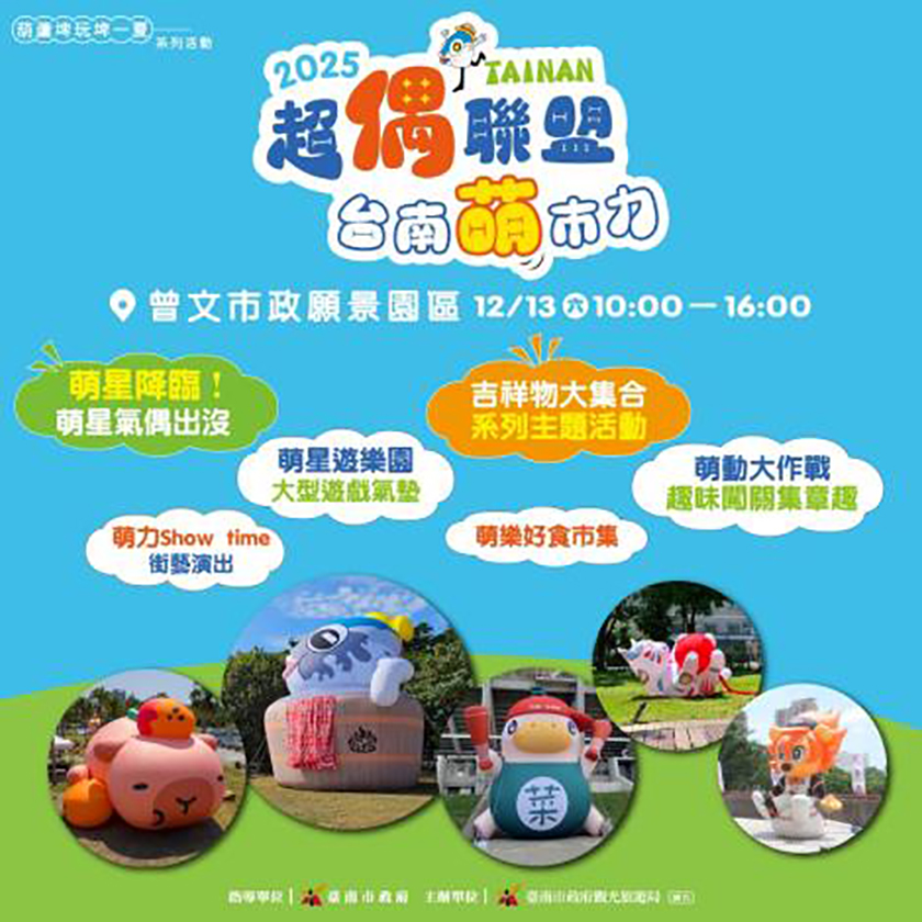 城市生活報 | 臺南採訪中心 編輯報導 | 2025.12.03 | 由臺南市政府觀光旅遊局主辦的葫蘆埤《玩埤一夏》系列活動之一──「2025超偶聯盟‧臺南萌市力」將於 12 月 13 日在「麻豆曾文市政願景園區」熱鬧登場!活動集結 10 位臺南人氣吉祥物明星與 5 座氣偶展示,並推出趣味闖關、氣墊遊戲、街頭藝人表演及超過 25 攤的美食市集。黃偉哲市長誠摯邀請市民與全國遊客攜家帶眷,共度最萌、最歡樂的年末週末。 ★10位萌力吉祥物大集合 現場將有觀旅局「魚頭君」、西拉雅「灰熊熊」、市場處「菜籃仔」、動保處「豆哥&凱娣」、體育局「大員&甜甜」、左鎮化石園區「KOKO」、市立圖書館「蛙寶」與統一獅「萊恩」同台亮相,陪民眾玩遊戲、互動拍照超療癒。 此外,5 座吸睛大型氣偶也將亮相,包括泡溫泉的魚頭君、俏皮菜奇鴨、療癒卡比胖拉、帥氣萊恩及魅力巷仔 Niau,粉絲一定要現場收集滿滿萌照! ★親子必玩:闖關拿市集券+氣墊遊戲+精彩街藝 現場備有互動式闖關活動,限量 400 張集章卡,完成 4 項挑戰即可兌換 50 元市集券(數量有限,換完改贈小禮物)。另有 2 座大型氣墊讓小朋友盡情放電,並安排 4 組街頭藝人輪番演出,包括故事互動、夢幻泡泡秀、小丑氣球魔術秀等,適合親子一起嗨玩一整天。 ★萌樂好食市集 × 2025臺南購物節抽大獎 活動市集匯集在地小農、手作 DIY、美食小吃等 25 攤以上攤位,拿著闖關獎勵市集券更能吃得划算、逛得開心。 此外,2025 臺南購物節消費抽獎持續至 115 年 3 月 1 日,只要在臺南消費滿 50 元即可參加抽獎,活動現場市集亦適用。透過 LINE 官方帳號即可輕鬆登錄發票,還有機會把百萬名車、家電、露營用品、住宿券、現金等好禮帶回家。 觀光旅遊局林國華局長表示,「2025超偶聯盟‧臺南萌市力」結合吉祥物魅力、親子遊戲與在地美食,是年底最具看點的家庭活動。歡迎民眾一起規劃臺南小旅行,順遊總爺藝文中心、麻豆代天府等景點,與吉祥物共度充滿萌趣與笑聲的美好週末。 |