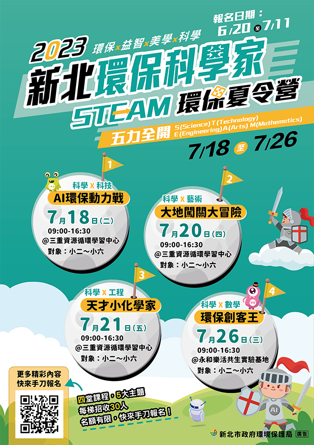CLN城市生活報 | 本報編輯部 新北編輯報導 | 2023.06.20 | 新北市環保局今年7月將以「STEAM」教育舉辦4場次單日營隊活動-「環保科學家STEAM環保夏令營」,結合環保與STEAM教育五大領域─Science(科學)、Technology(科技)、Engineering(工程)、Arts(藝術)及Mathematics(數學),搭配有趣的遊戲、實驗、DIY等活動,帶領國小學童一起探索環境知識。報名期間自今(20)日起至7月11日止,報名網址為https://www.epd.ntpc.gov.tw/Activity ,每場次主題不同,各限30個名額,歡迎國小學童踴躍報名,一起成為小小環保科學家。 環保局表示,本次營隊針對國小二年級至六年級學生辦理,引入「STEAM教育」概念,將科學分別與技術、工程、藝術和數學等元素融合,共規劃4場次不同主題的環境教育課程,期望能激發學員進行多面向探索,時間分別為7月18日、20日、21日及26日,每場限30個名額,將透過實際操作和互動遊戲,在有趣的學習環境中,帶領學員一起認識循環經濟、AI智慧應用及生活中各種環保議題。 環保局進一步說明課程內容,科學及科技領域課程將前往位於五股夏綠地的「新北市資源循環教育基地」,了解資收分選工作如何結合AI人工智慧,提升效率及資源再利用率;科學及工程領域課程則透過環保手工皂DIY,探討皂化反應、環境賀爾蒙、廢食用油污染等議題;而科學及藝術領域課程安排學員自製卡林巴琴,與音樂結合、賦予資收物新生命;科學及數學領域課程將數學概念實際應用、融入DIY課程中,以回收吸管製成環保樂器,培養學員跨領域素養。 此外,營隊課程運用了益智桌遊及大地闖關遊戲,以輕鬆有趣的方式引導學員認識資源回收物、掌握環保知識,期待帶給孩子們難忘的學習體驗,並培養他們對環保議題的敏感度和關注度,在日常生活中實踐環保行動。 |
