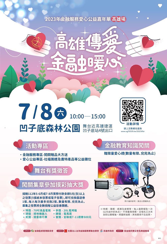 CLN城市生活報 | 本報編輯部 高雄編輯報導 | 2023.06.29| 高雄市政府與台灣金融服務業聯合總會將於112年7月8日(星期六)上午10時到下午15時在本市凹仔底森林公園(近凹仔底捷運站4號出口)聯合主辦「金融服務愛心公益嘉年華」。金融總會為讓社會大眾瞭解金融業界推動金融教育及社會公益之投入及努力,自102年起陸續與各地方政府共同舉辦金融公益活動,本次活動是繼疫情之後暌違2年盛大回歸舉辦,首站就選擇高雄,期能凝聚金融業界善心,透過活動結合民眾之力,引發社會愛心共響。 今年高雄場金融總會號召金融業界對在地弱勢團體進行愛心捐款高達新臺幣220萬元,活動當天規劃由金融監督管理委員會長官、金融總會代表及各金融公會理事長與金融機構董事長出席開幕及捐贈儀式,並由市府代表受贈並頒發感謝狀予各捐贈單位。另外活動兌換園遊券所募集的發票也將全數捐贈給本市社福單位,市府在此表感謝之意。 高雄市政府表示,當天現場有精采的表演、抽獎活動,及超過上百個金融服務愛心公益攤位,民眾只要拿112年5-6月或7-8月紙本或電子發票5張即可兌換園遊券,參與各金融攤位知識宣導互動遊戲,集滿3個戳章可兌換限量精美小禮-環保袋,並參加摸彩活動,活動獎項包括70吋液晶電視、掃地機器人、摺疊車、20L電烤箱等豐富獎品。 此外,活動攤位特別邀請華山基金會、高雄市唐氏症歡喜協會等公益攤位義賣愛心商品,及本市在地農民設攤,帶來最天然、有在地風味的小吃,還有與民眾息息相關的市政宣導小遊戲。歡迎民眾踴躍參與活動,歡樂之餘也散播愛,更多活動詳細資訊可查詢金融總會網站活動資訊專區http://www.sgf3535.tw/2023tfsr/。 |