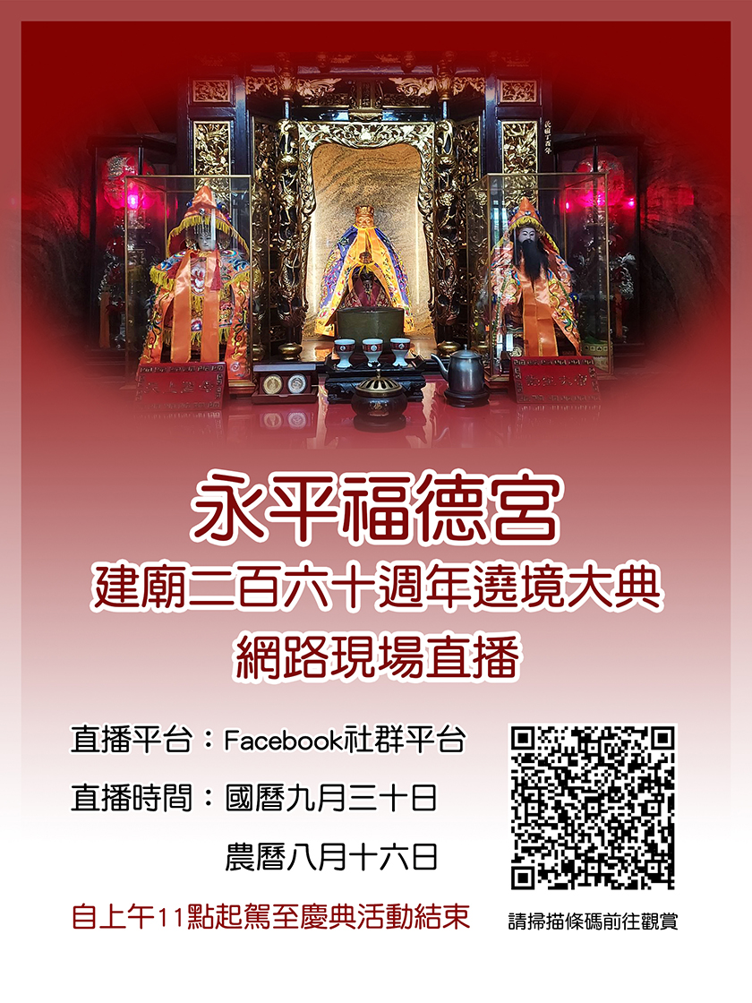 CLN城市生活報 | 本報編輯部 台北市社子編輯報導 | 2023.09.28 | 位於台北市士林區社子地區的「永平福德宮」,將於9月29日至10月1日舉辦「永平福德宮建廟260週年慶典活動」,其中30日(星期六)舉辦社子地區遶境慶典活動,本次遶境活動除建廟始自清朝乾隆1763年的土地公神尊遶境外,並出動了成立百年的「三樂軒北管樂團」所典藏近百年的周倉及關平神將兩大神將,全程參與這次遶境慶典活動,遶境活動將全程透過Facebook社群平台全程現場網路直播,歡迎各界參與點閱觀賞。 社子「三樂軒北管樂團」所典藏近百年的周倉及關平神將,於108年12月至110年5月間,參加由「國立傳統藝術中心」所主辦的「憨子弟瘋亂彈」「台灣北管藝術大展」展覽,這次修繕後全程參與遶境,將是廟會活動中與國寶級神將共同遶境不可多得的難得的機會。 歡迎各界信眾屆時前往「永平福德宮」參與建廟260週年遶境活動,並掃描Facebook社群QRcode條碼觀賞直播。 |