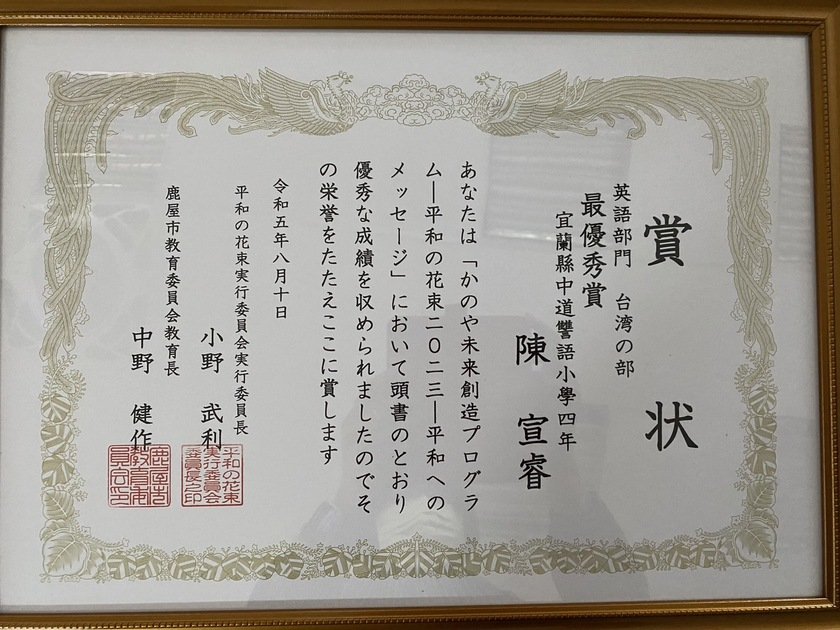 宜蘭中道雙語小學學生陳宣睿勇奪「卡諾亞未來創造計劃-2023年和平之花」英語故事比賽特等獎 中道雙語小學的五年級學生-陳宣睿,日前在日本主辦的「卡諾亞未來創造計劃-2023年和平之花」英語故事比賽中脫穎而出,榮獲海外小學生組特等獎。這項激烈的比賽吸引了來自全球的6000多名參賽者,陳宣睿以他感人的和平之花故事贏得了評審的青睞。 故事以1945年5月31日的台北為背景,描述了一位名為「春」的年輕人的經歷。當時,「春」正準備把他在基隆河邊的鴨寮收集的鴨蛋帶到市場換取生活用品。然而,當他走到半路時,突然空襲警報聲響起,春被驚慌地推動著,手中提著的鴨蛋滾落一地。在爆炸聲越來越近的情況下,春在一陣巨響中失去了平衡,但一顆炮彈碎片卻奇蹟般地割破了他的帽子,卻沒有傷害到他的頭部。幸運地活了下來的「春」流著淚繼續前行,並最終抵達市場,只帶著一些零錢回家。 在他的故事中強調了和平的可貴性,並提醒我們即使在最困難的時刻,命運也可以有意外的轉折。這個故事讓我們意識到,和平不僅僅是一種願景,而是一種寶貴的資源,需要我們不斷努力來維護和守護 陳宣睿表示:「我們每一個人都可以盡一份心力來促進世界和平。開放的溝通和用心理解每一個人,可以彌合不同文化、意識形態和利益之間的差距,促進和平共處,這才能保證我們為子孫後代保存地球永續發展的機會。」 他的故事提醒我們記住那些經歷戰爭的人所做的犧牲,並努力追求和平的世界,確保未來可以在和諧的世界裡分享類似春的故事。 陳宣睿的勝利為宜蘭中道雙語小學帶來了光榮,同時也鼓勵了我們所有人為實現世界和平共同努力。 |