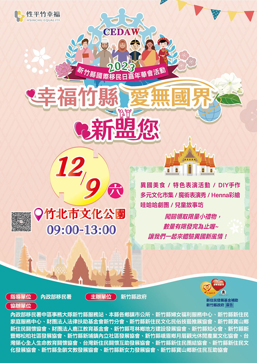 城市生活報 | 本報編輯部 新竹編輯報導 | 2023.12.07 | 一年一度的移民日慶祝活動來囉!2023縣國際移民日嘉年華會將於本週六12月9日上午9時至下午1時,在竹北市文化公園熱鬧登場,除了有許多特色創意商品市集,還有闖關互動領獎品及限量的henna彩繪體驗等,歡迎大小朋友一起來逛市集、玩遊戲,認識異國文化。 縣長楊文科表示,新竹縣是多元文化的城市,希望各族群透過每年的國際移民日活動推廣多元文化,讓新住民與在地居民相互了解,彼此尊重不同文化,多元和諧的氛圍是國際化城市公民須具備的素養。 社會處表示,縣府每年為新住民舉辦一場大型的文化多元融合盛會,今年也不例外,安排系列精采活動,包含多元文化舞台展演、親子DIY體驗、異國文化故事區、異國風美食攤位、闖關活動等,每年亦舉辦「成長共融」新住民表揚活動,頒發獎座感謝模範新住民家庭及新住民學習楷模融入臺灣的努力與付出。 為讓現場民眾了解更多新住民特色文化,除了邀請新住民展售家鄉美食,也讓新住民藉由繪本介紹家鄉的文化,拉近彼此距離,此次活動也導入CEDAW「消除對婦女一切形式歧視公約」概念,請哇哈哈劇團特別演出性平短劇,希望透過歡樂的戲劇把性平概念植入人心。歡迎大家一起來2023新竹縣國際移民日嘉年華,共創文化多元相互尊重的未來。 |