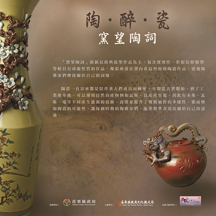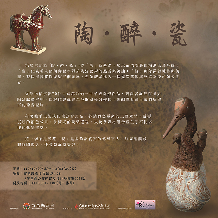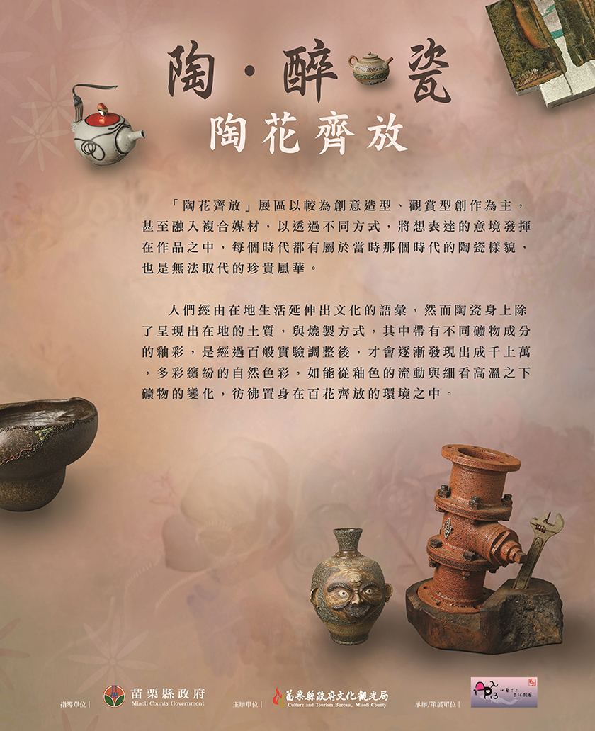 城市生活報 | 本報編輯部 苗栗編輯報導 | 2023.12.20 | 苗栗是陶瓷工藝的故鄉,縣府為推廣陶瓷藝術親民普及化,規劃於苗栗陶瓷博物館展出「陶.醉.瓷:苗栗陶藝的魅力之旅」苗栗陶瓷博物館典藏展,展期自112年12月20日起至113年02月29日止於苗栗陶瓷博物館展出超過一甲子的館藏經典作品,總共展出近70件作品,歡迎民眾各界蒞臨參觀,一起沉醉於陶瓷的獨特魅力當中。 本次展覽委請苗栗在地青年藝術家團體「心藝十三生活創藝」工作室策展辦理,主題為「陶.醉.瓷」,以「陶」為基礎,展示苗栗陶藝的精湛工藝基礎;「醉」代表著人們與陶藝家對於陶瓷藝術的熱愛與沉迷;「瓷」則象徵著純粹與美麗。整個展覽將圍繞這三個元素,帶領觀眾進入一個充滿藝術與感官享受的陶瓷世界。 展覽主要分成「窯望陶詞」及「陶花齊放」兩大展區,「窯望陶詞」展區以經典造型作品為主,包含實用性、祭祀信仰類型等較具有功能性質的作品,像似座落在窯內看這些經典陶瓷作品,透過陶藝家們傳達屬於自己的詞彙;「陶花齊放」展區以較為創意造型、觀賞型創作為主,甚至融入複合媒材,以透過不同方式,將想表達的意境發揮在作品之中,每個時代都有屬於當時那個時代的陶瓷樣貌,也是無法取代的珍貴風華,藉此再展現於觀者的眼前。 展期從112年12月20日至113年02月29日,在苗栗陶瓷博物館 1F 、2F展覽空間辦理,希望藉由這次的展出,讓大家更完整了解和欣賞到不同技法、不同表現形式甚至不同世代的陶瓷作品,感受將許多精彩萬分的片刻集結成的故事,誠摯邀請喜愛陶藝的朋友蒞臨欣賞,期望每位進入苗栗陶瓷博物館看展的民眾,都可以沉醉在陶瓷的花花世界裡面。 |