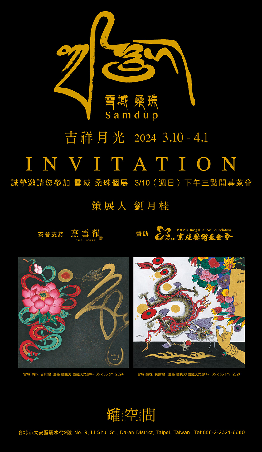 城市生活報 | 本報編輯部 台北編輯報導 | 2024.03.01 | 吉祥月光 雪域桑珠個展 2024/03/10 - 2024/04/01 展期|2024/03/10(日)-04/01(一) 茶會|2024/03/10(日)下午三點 地點|罐空間 台北市大安區麗水街9號 誠摯邀請參加雪域桑珠個展 3/10(週日)下午三點開幕茶會 <策展人>劉月桂董事長 <贊助單位>財團法人 King Kuei Art Foundation 京桂藝術基金會 雪域桑珠吉祥龍畫布壓克力西藏天然原料65 x 65 cm 2024 雪域桑珠長壽龍畫布壓克力西藏天然原料65x65cm 2024 <桑珠>雪域工畫師 唐卡顯密佛像 整理補修佛像 壇城佛堂規劃設計 佛像教學 三位老師檢定合格 三十六年畫畫資歷 1982 八歲時在楚誠嘉措老師門下學習唐卡完成學業 1989 前往西藏佛法中心拉薩 在許多家庭畫唐卡與畫壁 1991-1999 在尼泊爾加德滿都大波塔、南印度哲蚌寺、 北印度達蘭沙拉及比爾衝仍寺等地繪製壁畫及唐卡 2004 受到藏傳格魯教派宗喀巴大師法座傳承101任甘丹墀巴 龍日南傑大法王認證 2005 薩迦大堪布貢噶旺秋仁波切認證 2012 北京《世界藝術》雜誌專訪 2012 京桂藝術基金會唐卡展 金身光芒 2013 非池中藝術網專訪 2014 法界衛星電視台專訪 2014 京桂藝術基金會唐卡展 金身光芒-再現 2015「佛光照星雲‧華蓋九秩嵩壽-兩岸祝壽展」-台北國父紀念館 2016 京桂藝術基金會常態展 2017 京桂藝術基金會唐卡‧書法雙個展 2017 高雄展覽館唐卡作品展出 2017 台北世貿館唐卡作品展出 2017 人間衛視採訪報導 西藏唐卡重現 2018 西藏宗教文化展-台北花博爭艷館 |
